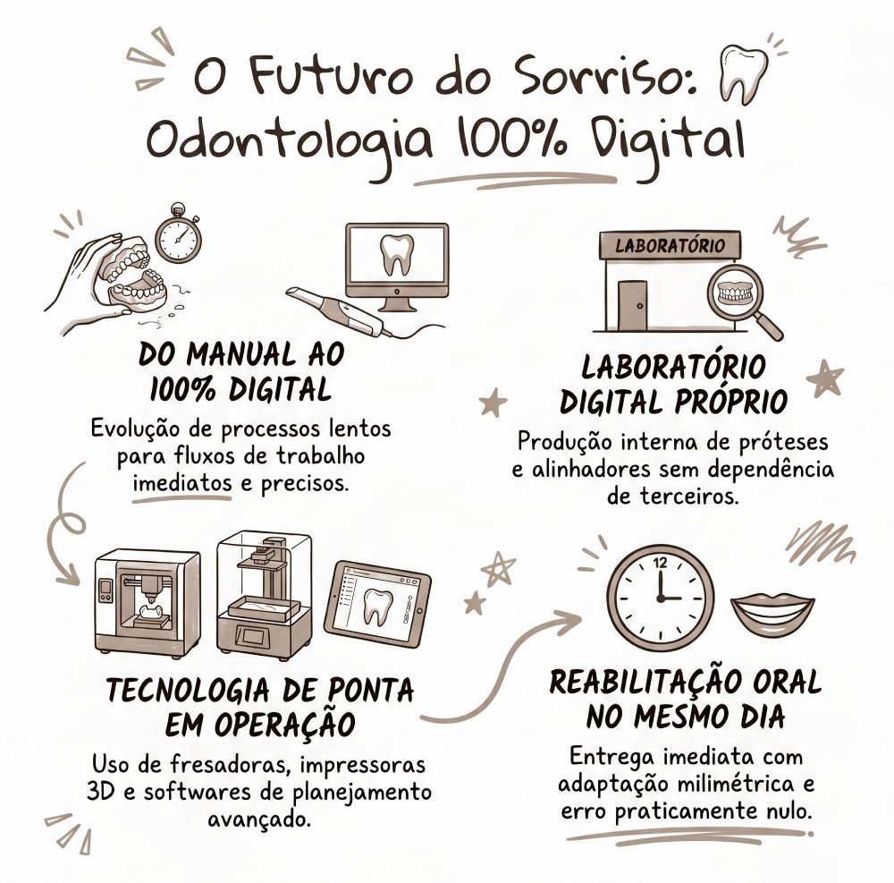 Foi essa visão técnica e focada em performance que impulsionou a criação do nosso Laboratório Digital Próprio. Ao internalizar a produção de próteses, lentes de contato e alinhadores invisíveis, eliminamos a dependência de serviços terceirizados e os longos prazos de espera. Hoje, operamos com fresadoras de última geração, impressoras 3D e softwares de planejamento avançado. Essa infraestrutura nos permite executar protocolos de reabilitação oral em Campinas no mesmo dia, com uma margem de erro praticamente nula e adaptação milimétrica.